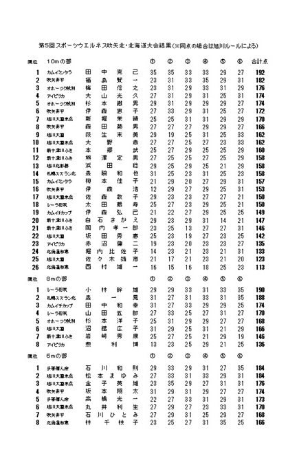 参加者は、申込みは47名でしたが、体調不良等で5名の欠席があり42名(10m26名・8mおよび6mが各8名)で行われました。結果は、日頃の練習の成果を遺憾なく発揮された方。。よりは十分実力を発揮出来なかった方の方が多い印象を受けました。ただ、お会いする機会の少ない他支部の会員の方との交流ができたという点では、慰め合い(笑)も含めて所期の目的を達成できたのではないかと思われます。各自練習を積んで、次回こそみんなで頑張りましょう。